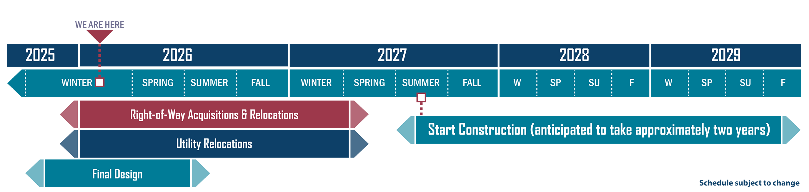 - Start Construction - anticipated to last approximately two years starting in Summer 2027 Schedule subject to change