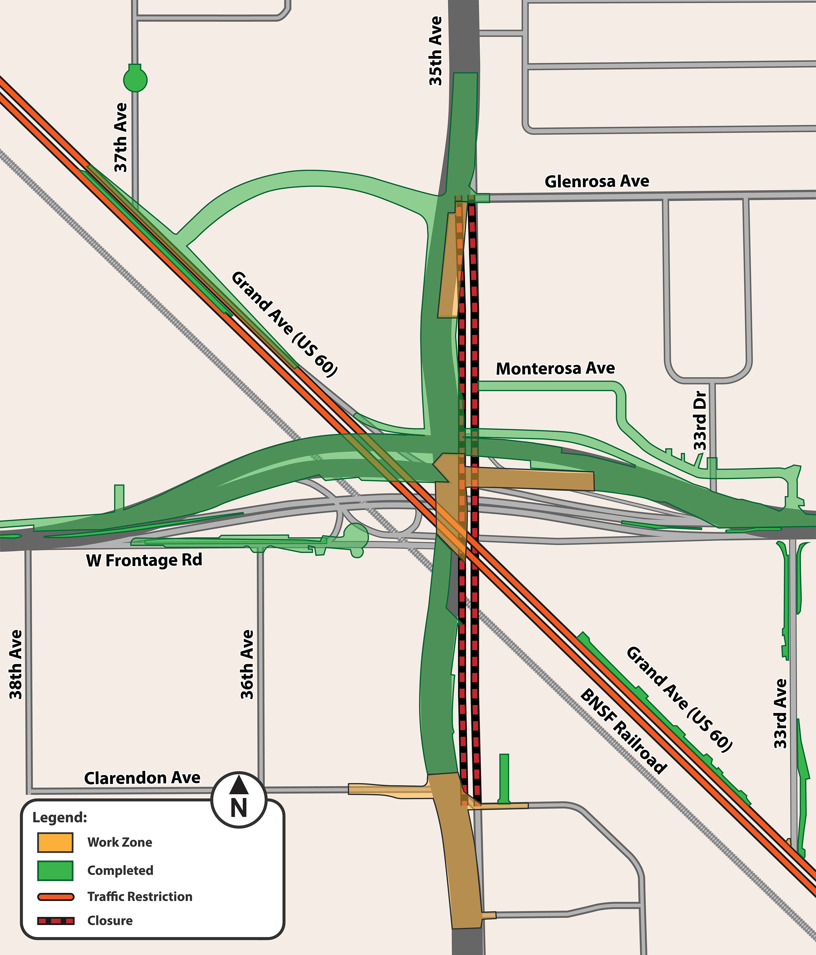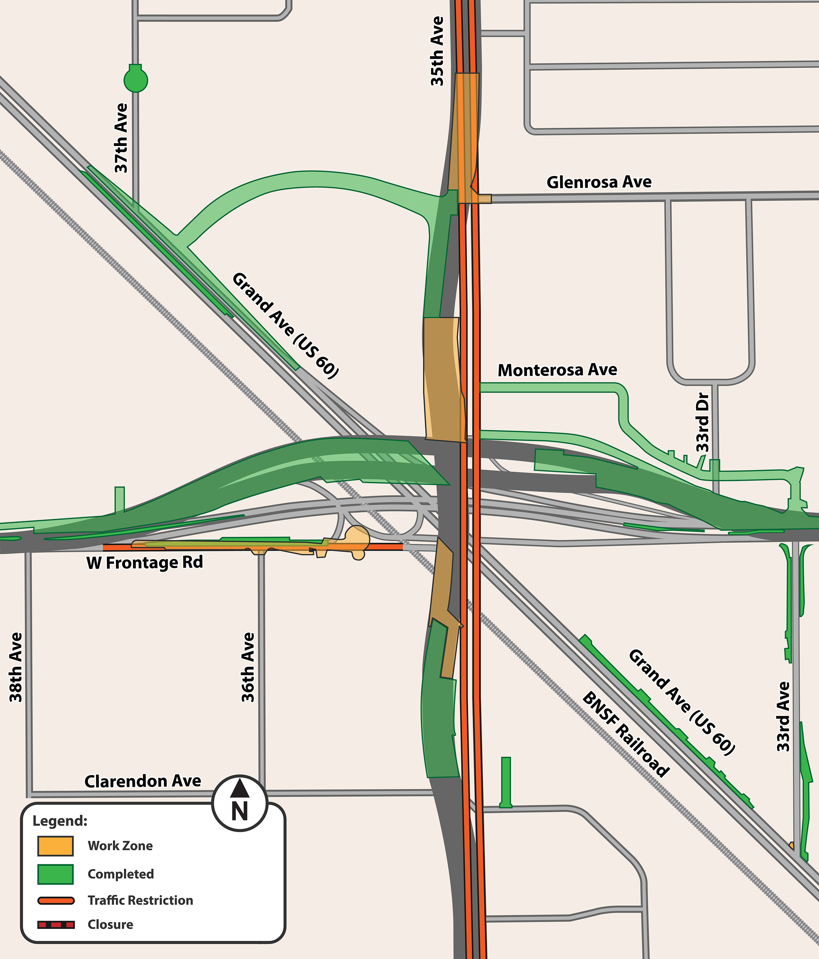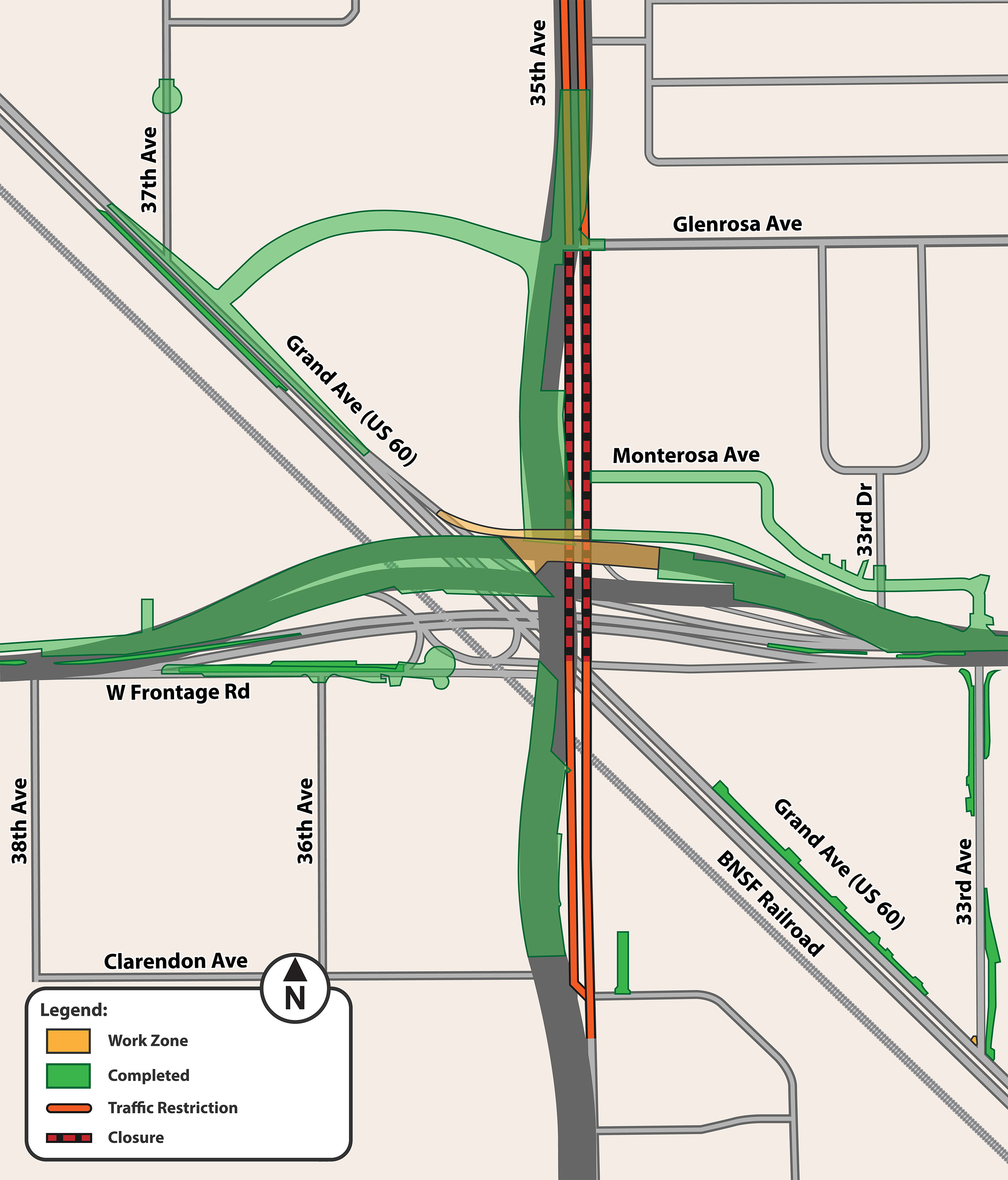 - A 7-month closure of 35th Avenue between Clarendon and Glenrosa Avenues for construction of the new roadway, roadway embankment, and bridges. During the closure, drivers can use 27th Avenue, 31st Avenue, and 43rd Avenue as alternate north-south routes.