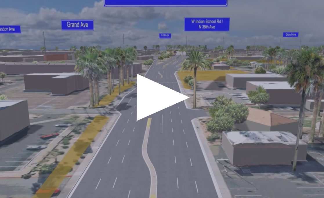 The Grand-35 Project will reconstruct the intersection of Grand Avenue, 35th Avenue and Indian School Road to improve traffic flow and safety and reduce vehicle-train conflicts. The project will create a new elevated intersection of 35th Avenue and Indian School Road over Grand Avenue, allowing traffic on Grand Avenue to flow freely and eliminating vehicle crossings with the BNSF Railroad. The project will also include modifying other local roadways in the area to provide connectivity and maintain access to properties. See the Project Improvements tab for more details on the specific improvements.