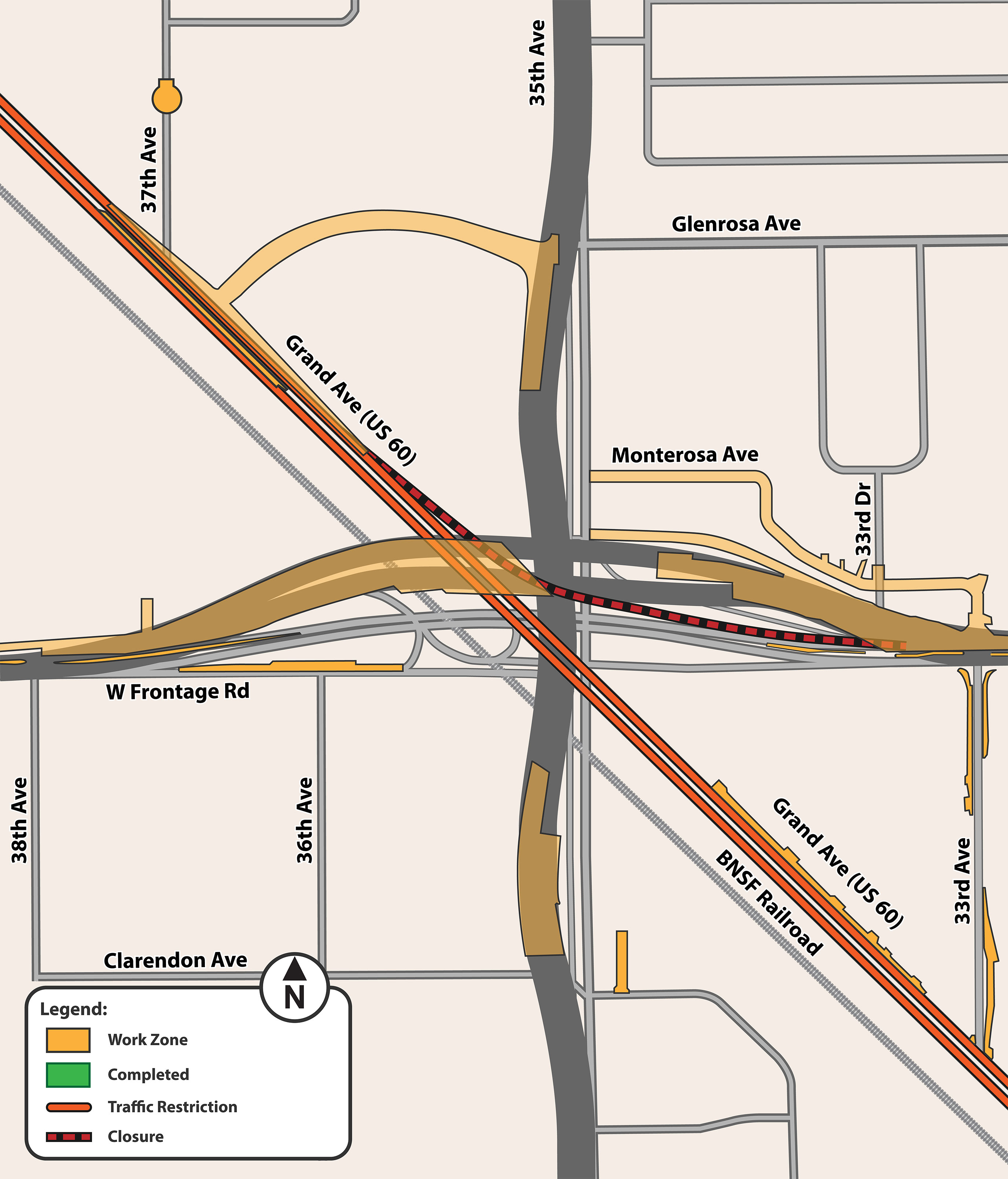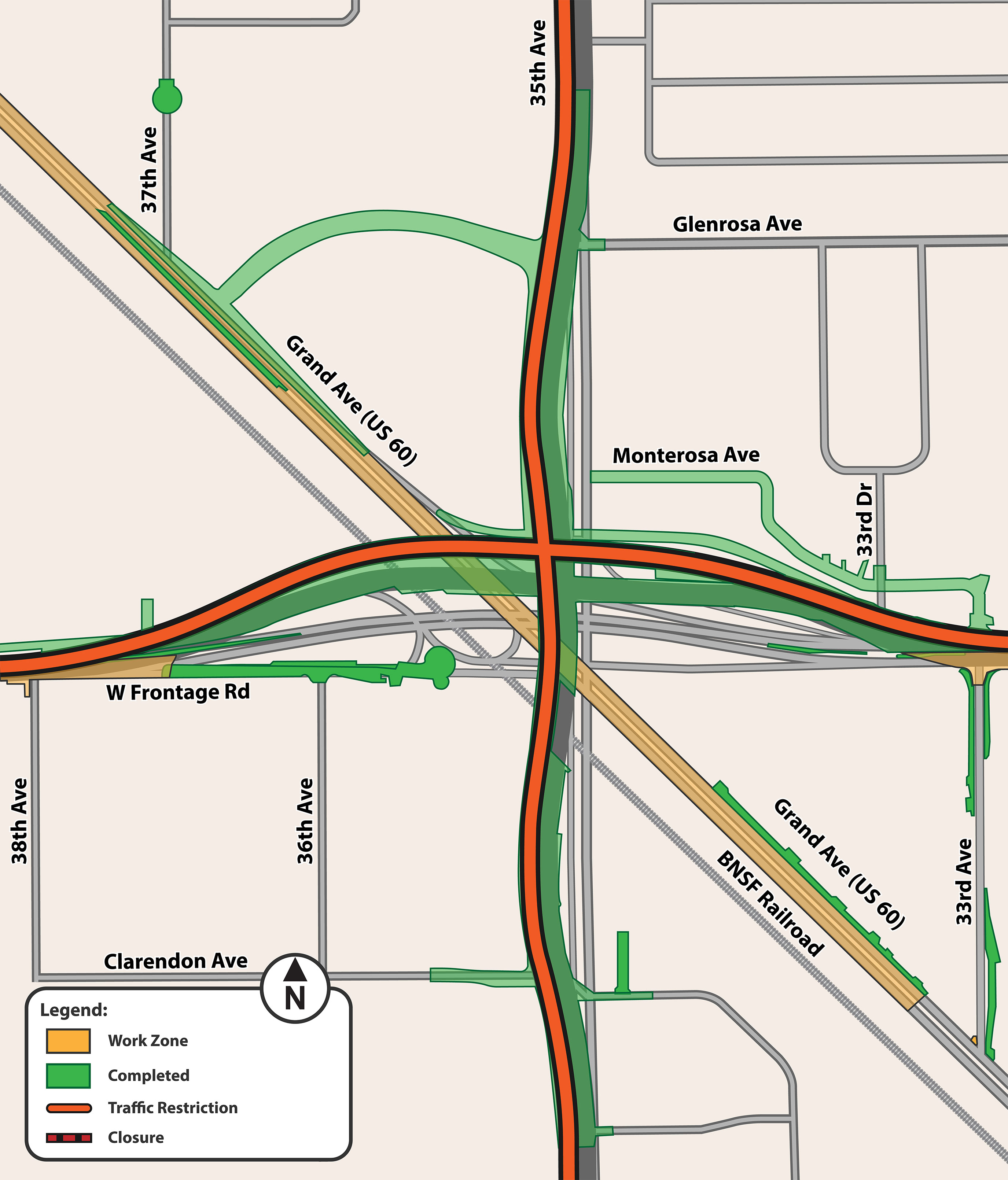- A 7-month closure of 35th Avenue between Clarendon and Glenrosa Avenues for construction of the new roadway, roadway embankment, and bridges. During the closure, drivers can use 27th Avenue, 31st Avenue, and 43rd Avenue as alternate north-south routes.